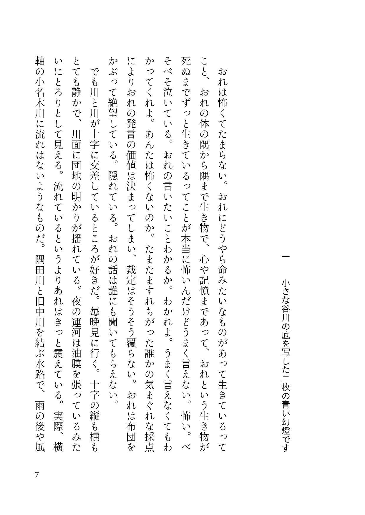 でも川と川が十字に交差しているところが好きだ。毎晩見に行く。十字の縦も横もとても静かで、川面に団地の明かりが揺れている。夜の運河は油膜を張っているみたいにとろりとして見える。流れているというよりあれはきっと震えている。実際、横軸の小名木川に流れはないようなものだ。隅田川と旧中川を結ぶ水路で、雨の後や風の強い日くらいしかはっきりした流れを見せないし、流れの向きもしばしば変わる。きっとここには始まりも終わりもない。